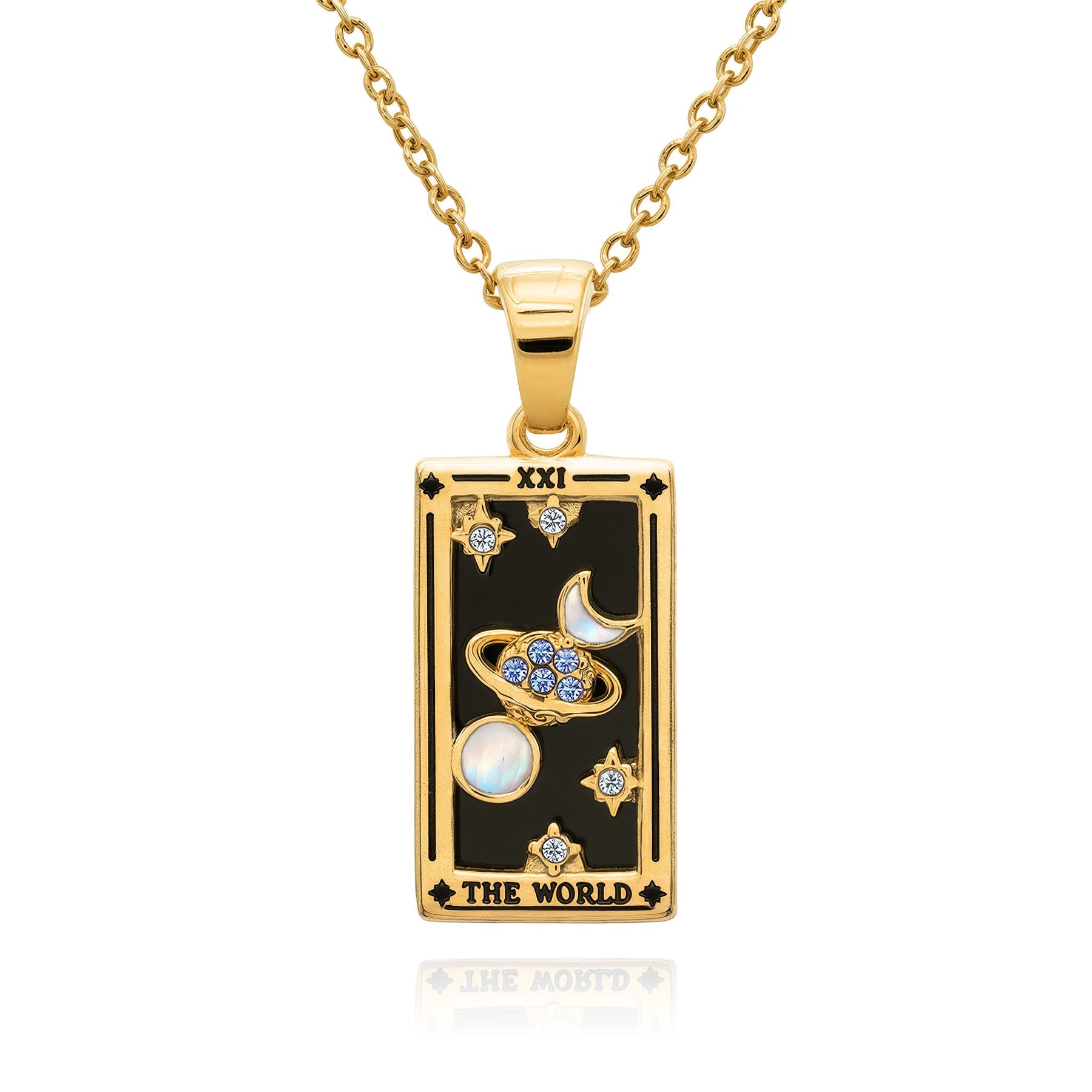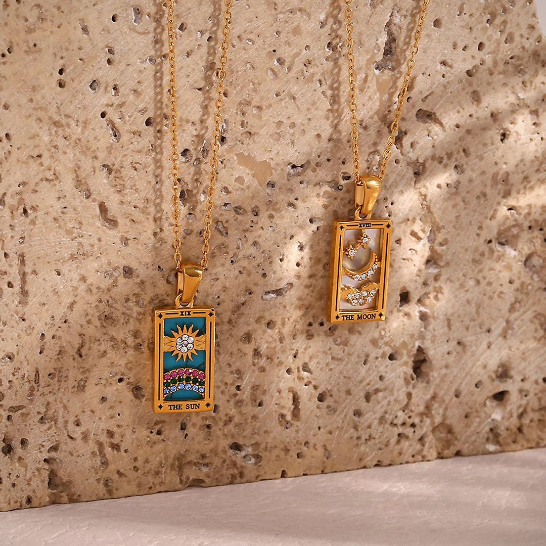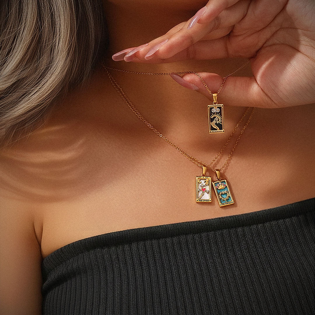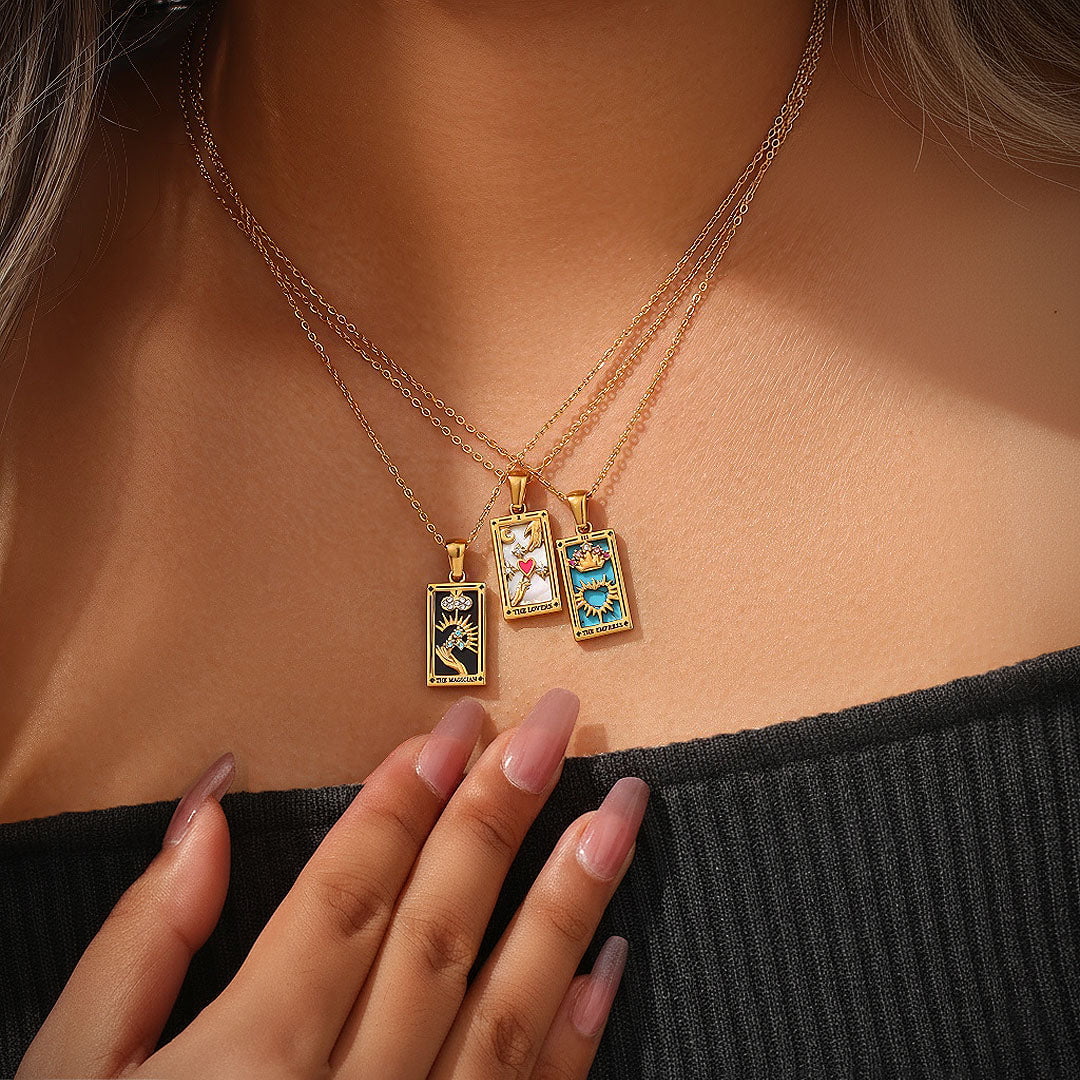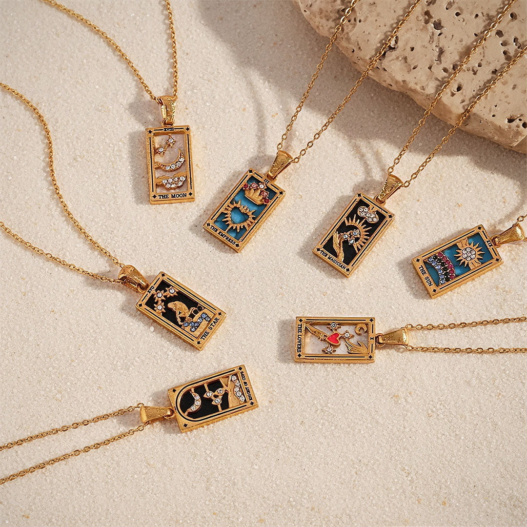 Each piece is infused with the wisdom of the tarot, brought to life through vibrant enamel backdrops and sparkling stones. Radiating positivity and meaning, these necklaces are talismans of guidance for your spiritual journey.